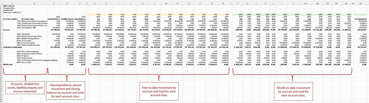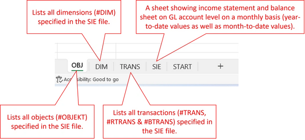 Fliken "SIE" innehåller en resultat- och balansräkning på kontonivå (kontonummer och kontonamn). Nästa sektion innehåller ingående balans (för balansräkningskonton), periodens saldo samt utgående balans. Den tredje sektionen innehåller year-to-date-saldo (ackumulerat saldo) månadsvis för respektive konto. Den fjärde sektionen innehåller respektive månads saldo. De månader som visas i den tredje och fjärde sektionen styrs av det räkenskapsår som anges i SIE-filen.