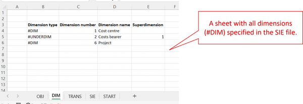 Fliken "DIM" innehåller en lista på alla dimensioner i SIE-filen, dvs alla rader som börjar med #DIM. Ett dimension innehåller ett eller flera objekt och ska därför ses tillsammans med informationen på flik "OBJ".