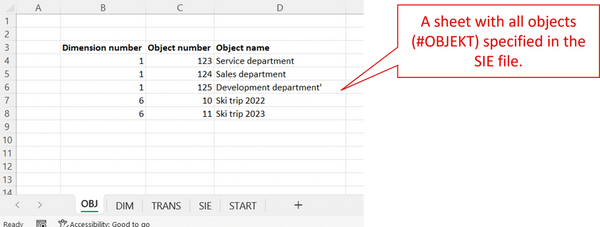 Fliken "OBJ" innehåller en lista på alla objekt i SIE-filen, dvs alla rader som börjar med #OBJEKT. Ett objekt är en dimensionsmedlem och ska därför ses tillsammans med informationen på flik "DIM".