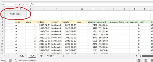 En vanlig del av revisionen är att revisorn gör ett antal test/kontroller av bolagets samtliga verifikationer och transaktioner under ett räkenskapsår. På flik "TRANS", uppe i vänstra hörnet, finns en knapp som heter "Audit tests" som öppnar ett popup-fönster där sådana tester kan köras.