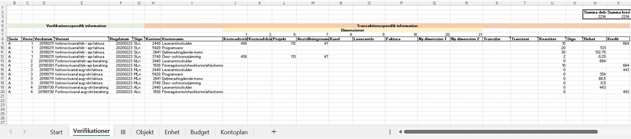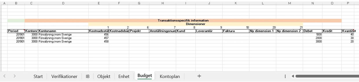 På flik "Budget" kan budget per kontonummer och period anges. Likt fliken "Verifikationer" stödjer denna flik dimensioner. Samma dimensionsnummer och dimensionsnamn som anges på flik "Verifikationer" bör användas här.