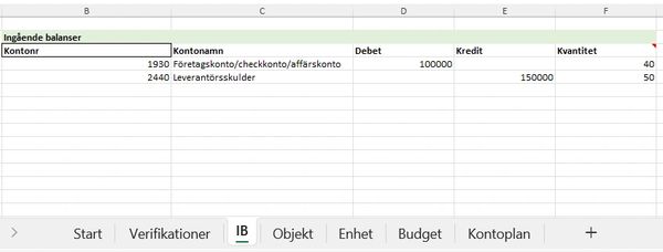 På flik "IB" kan ingående balanser för konton anges. Mallen stödjer även kvantiteter.