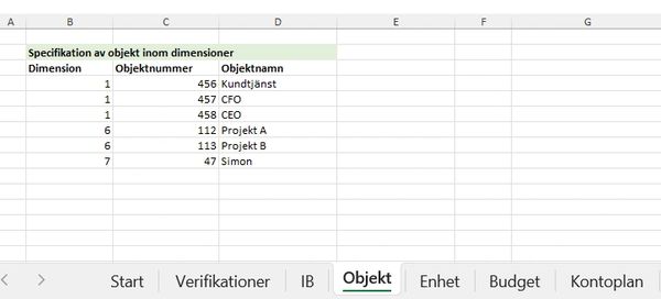 På flik "Objekt" definieras de objekt ("dimensionsmedlemmar") som ni vill referera till / ange på flik "Verifikationer". Dimensionerna och objekten som anges på flik "Verifikationer" måste alltså finnas på denna sida (och tvärt om).