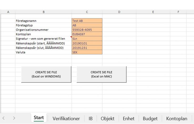 Mallen består av flikarna som visas i bilden ovan. På fliken "Start" anges övergripande information om företaget. På fliken finns även knapparna "CREATE SIE FILE (Excel on WINDOWS)" och "CREATE SIE FILE (Excel on Mac)" som du, beroende på om du använder Excel på Windows eller Mac, klickar på för att skapa SIE-filen när du har fyllt i all nödvändig information på de övriga flikarna.
